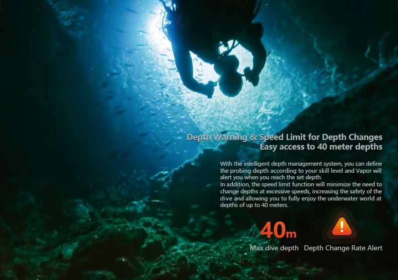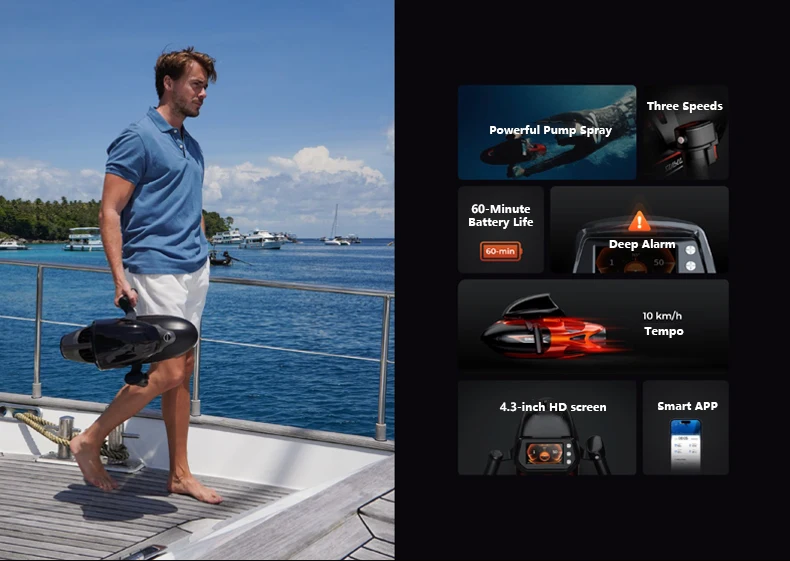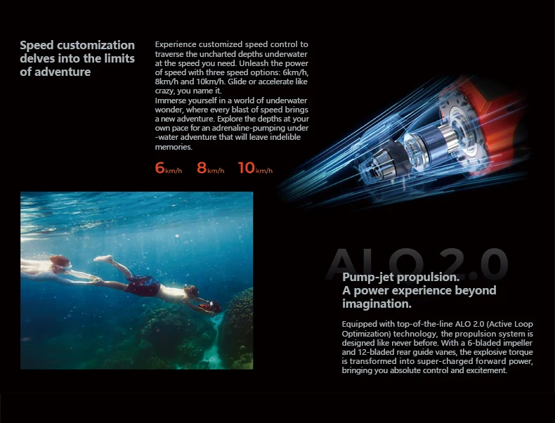 Operates safely to a maximum depth of 40 m, giving serious divers the flexibility to explore deeper environments. With a top speed of up to 10 km/h, it propels you through water with agility and smoothness. -