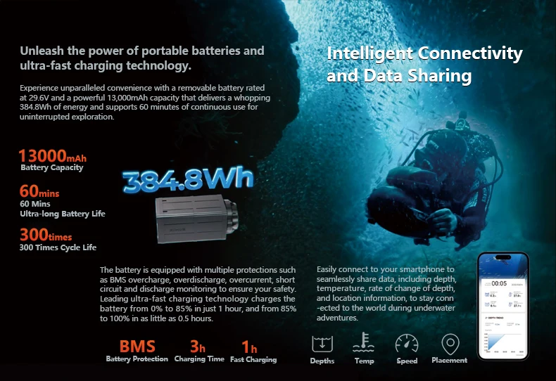 Safe & Reliable: Built for underwater conditions, the scooter’s sealed design protects against water ingress and ensures stable performance in diverse environments.